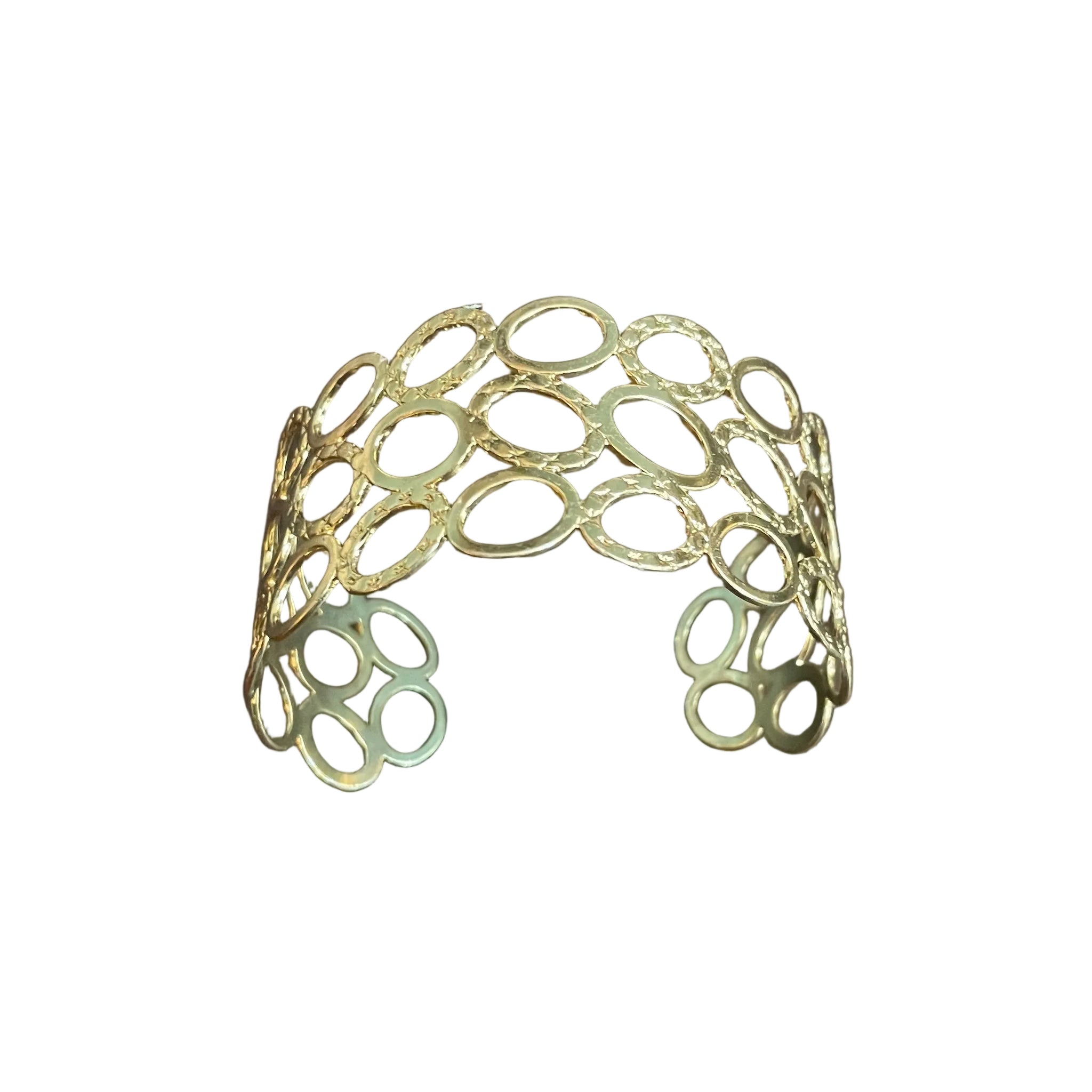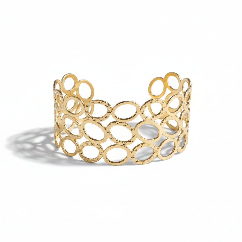 Slip on effortless elegance with this minimalist open circle cuff. Crafted from durable gold stainless steel, it strikes the perfect balance between understated and eye-catching. The clean, geometric design works solo or stacked with your favorite pieces, making it the ultimate versatile accessory. Whether you're dressing up or keeping it casual, this cuff adds just the right touch of shine to any moment.