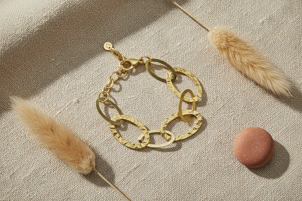 Timeless elegance wrapped around your wrist. This linked oval bracelet in warm gold stainless steel is the classic piece you'll reach for again and again. Simple, sophisticated, and endlessly versatile—it's jewelry that just works.