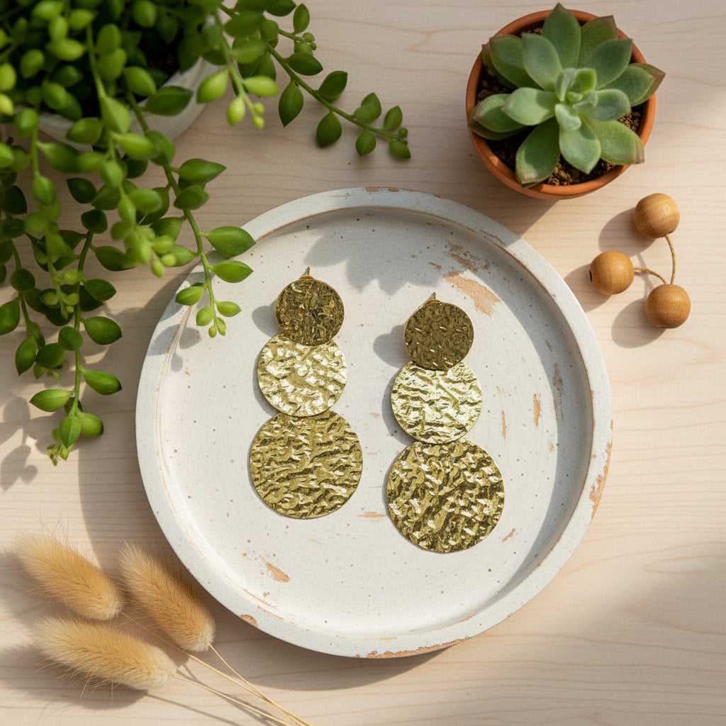 Layer on the boho magic with these Triple Disc Beaten Earrings in warm yellow stainless steel. Each earring showcases three textured, hammered discs that stack beautifully for maximum visual impact. The artisanal beaten finish gives them authentic handcrafted charm, while the lightweight design keeps them comfortable all day long.