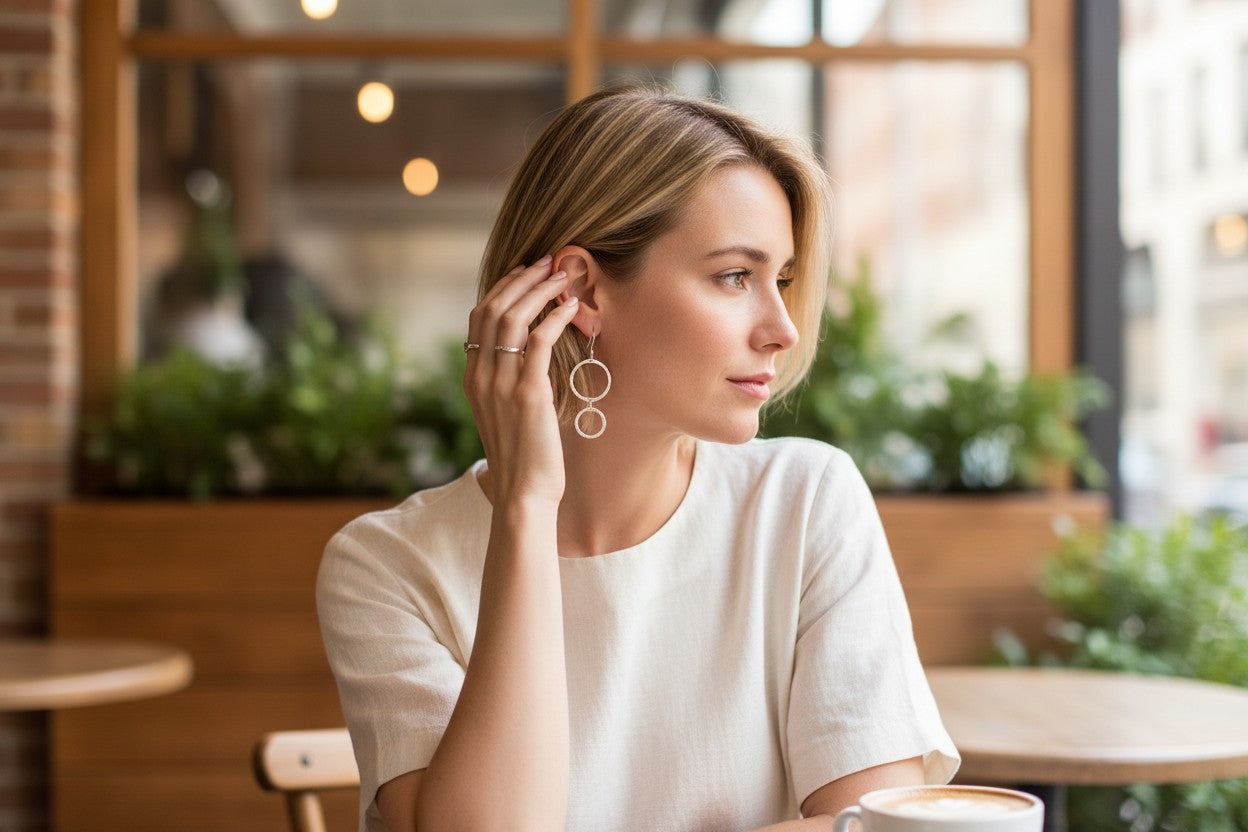 Add effortless style to any outfit with this unique pair of double hoop silver-coloured earrings. Perfect for any occasion and outfit, these earrings feature a simple and sophisticated design that will complement any look.